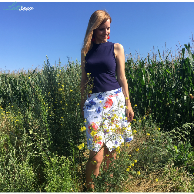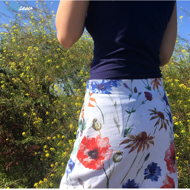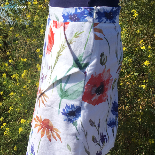 Zabawiłam się w spasowanie wzoru, ale tylko na przodzie spódnicy. Generowało to bardzo duże zużycie materiału i gdybym chciała jeszcze zadbać o zgodny wzór na szwach bocznych to chyba zużycie materiału byłoby dwukrotnie większe (poprzez spasowanie przodu zamiast 1,1 mb zużyłam prawie 1,5 mb – zostały mi jednak takie nijakie skrawki, że niektóre ledwo na kieszeń wystarczą). Przeniosłam też zamek z tylnego szwu na boczny, by tył zostawić w jednym kawałku.