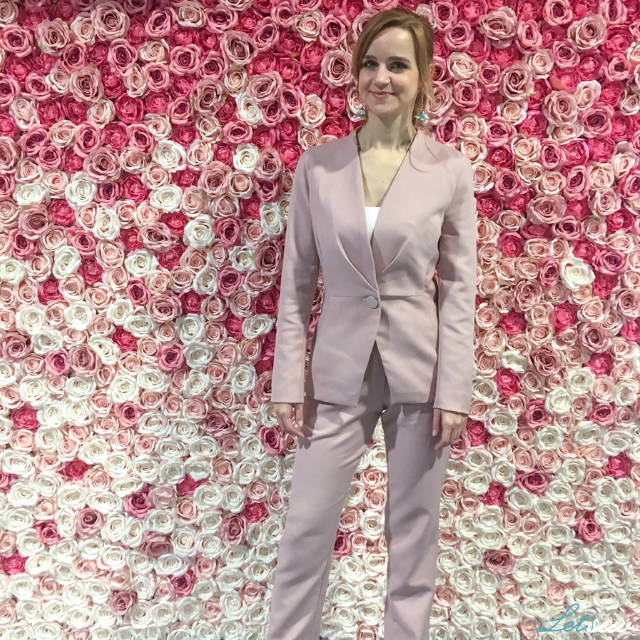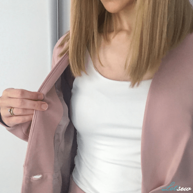Szycie całego garnituru szło bardzo sprawnie, materiał współpracował, marynarka leżała idealnie, wykrój nie wymagał żadnych poprawek. Pierwsze problemy pojawiły się przy podszewce – zabrakło mi podszewki na rękawy. Na szczęście w swoich zapasach znalazłam spory kawałek, który nadał się do skrojenia rękawów. W ostateczności podszewka płaszcza: to rękawy w kolorze żółtego złota, a reszta z różowego złota – także na bogato!