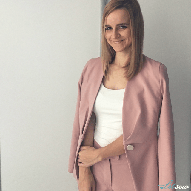 Na swój pierwszy garnitur wybrałam wykrój na marynarkę bez kołnierza, żeby stopniowo przekonywać się do szycia żakietów i zbyt szybko się nie zrazić. Spodnie to klasyka ze szkolnej formy. Standardowo wprowadziłam skośne kieszenie, bo uwielbiam je i kieszenie w spodniach są dla mnie bardzo praktycznym rozwiązaniem.