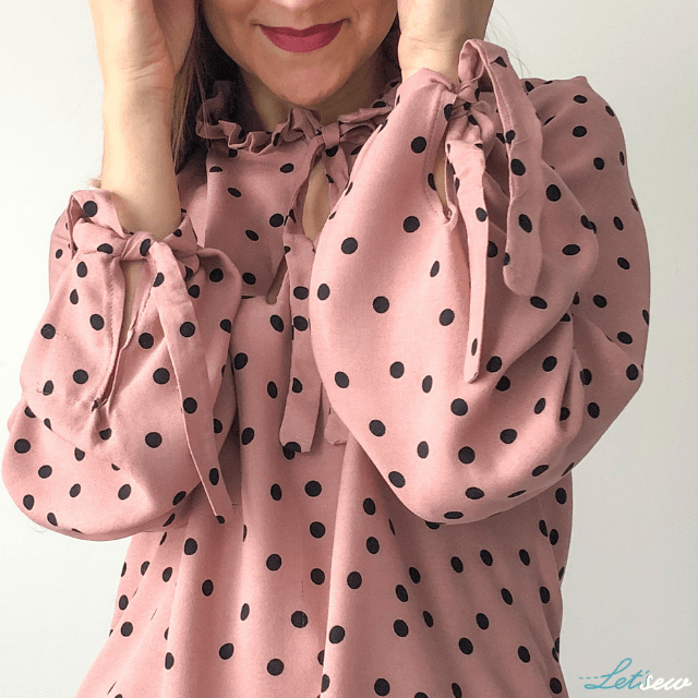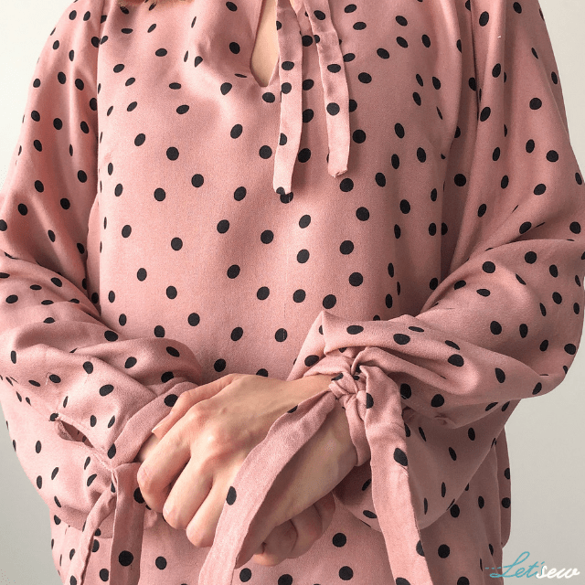 Bluzka ma sporo ciekawych detali. Przede wszystkim rękawy, które uwielbiam! Przy ozdobnej stójce troszkę się namęczyłam – musiałam zmniejszyć obwód, cały czas miałam problem z opadającymi zakładkami przy szyi, ale efekt końcowy jest zadowalający. Spódnica to klasyczny zmarszczony prostokąt na pasku. Połączenie bluzki z sukienką to piękna zwiewna sukienki w ponadczasowe grochy!