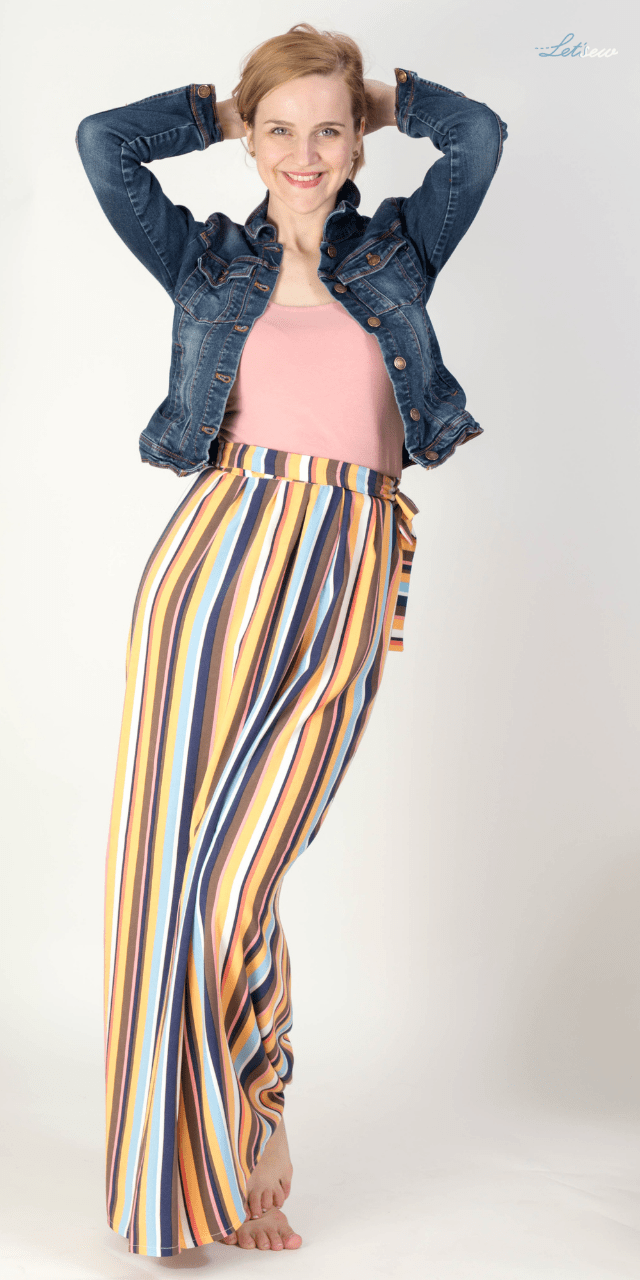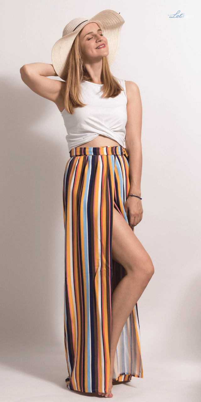 Zakochałam się w tych paskach od Miekkie.com i od razu wiedziałam, co z nich uszyję! Maxi spódnica idealnie sprawdza się na lato! Postanowiłam nie kombinować, tylko uszyć spódnicę z prostokąta, a właściwie dwóch. Jeden to spódnica – w talii są zakładki, aby lepiej się dopasowała do sylwetki. Drugi prostokąt to pasek. W pasku jest zrobiona dziurka (taka zwykła na guzik), bo postanowiłam zrobić kopertowy krój tej spódnicy.
