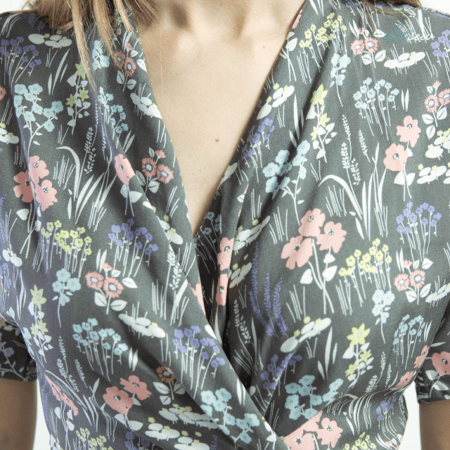 Spodobał mi się ten wykrój „od pierwszego wejrzenia”. Lubię niestandardowe rozwiązania, marszczenia, wiązania przy zachowaniu dość prostego kroju. Nie mogłam się jednak długo zdecydować, jaką tkanina byłaby odpowiednia. Nie chciałam kolejnej jednolitej sukienki, a mało które wzory mi się podobają. I eureka – ta łączka od miękkie.com mnie urzekła! Od razu połączyłam w głowie tkaninę z tym wykrojem i wiedziałam, że projekt wyjdzie świetny! I chyba się nie pomyliłam, co? 🙂