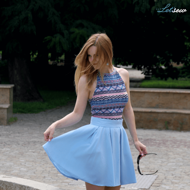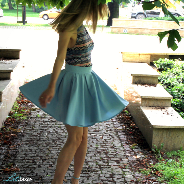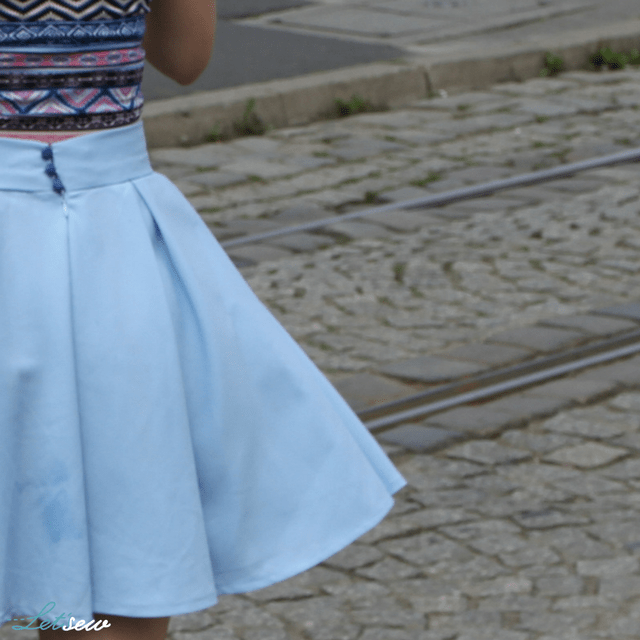 Niebieski od zawsze był moim ulubionym kolorem (butelkowa zieleń jest ulubiona dopiero od niedawna). Jak zobaczyłam ten piękny błękitny materiał, od razu wiedziałam, że musi coś z niego powstać do mojej letniej kolekcji. Zdecydowałam się na spódnicę z podwójnego koła z zakładkami – dzięki temu pięknie się układa 🙂