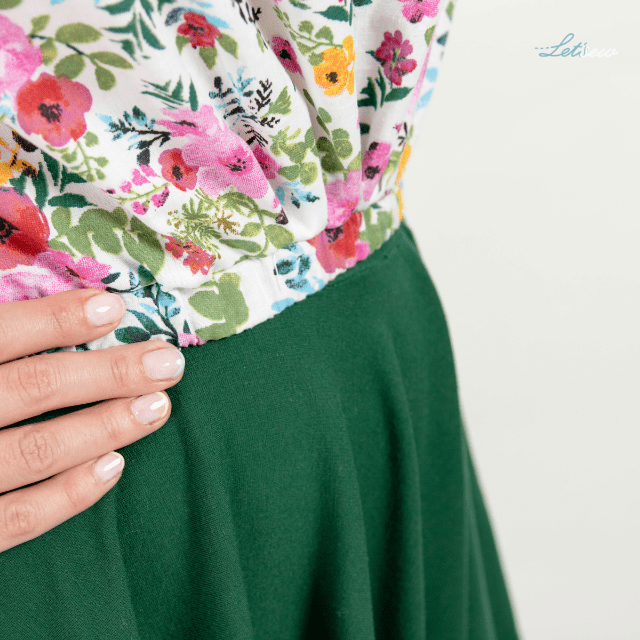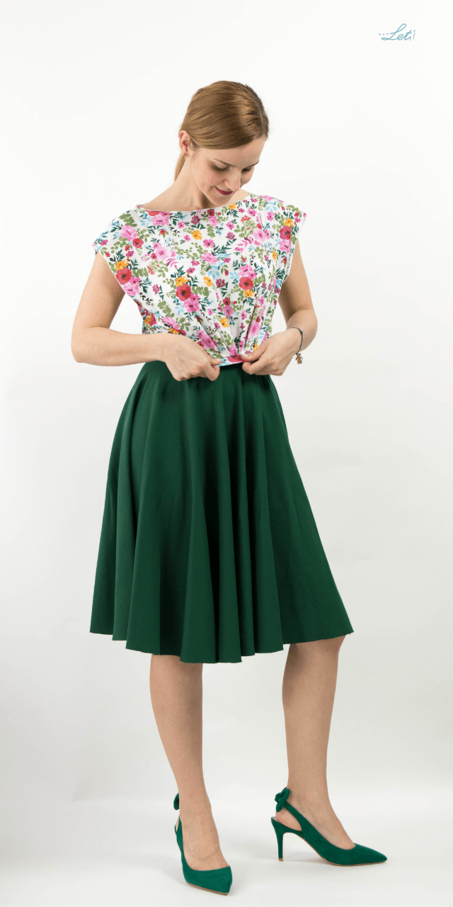 Bluzka świetnie komponuje się ze spódnicą z koła, która uszyłam jakiś czas temu z dzianiny. Już dawno chodziła za mną spódnicą z koła (dawno nic nie szyłam na bazie koła, zatem zrozumiała tęsknota z atym prostym wykrojem). Spódnica jest na pasku, bez żadnego zapięcia (zalety dzianiny). Jest na dole surowa, ale dzianina jest dość grubego splotu i nic się z tym dołem nie dzieje. Jest bardzo wygodna i pasuje zarówno do eleganckich, jak i sportowych stylizacji.