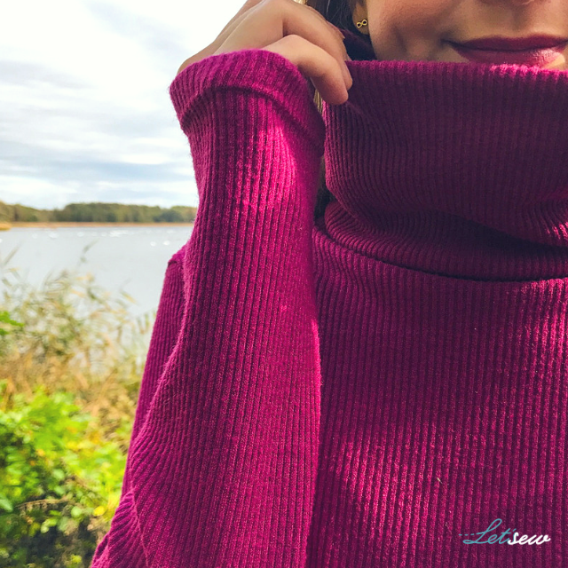 Do uszycia golfu użyłam swetrówki od Miekkie.com (te cieńszą, w ofercie jest jeszcze grubsza) – jest milutka i po kilku już praniach absolutnie nic się złego z nią nie dzieje. Kolor (burgund) jest obłędny, choć trudno go niestety uchwycić na zdjęciu (wszystko zależy od światła).